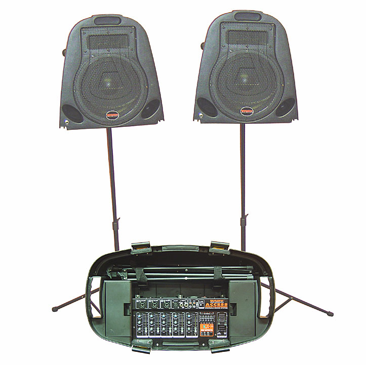 portable PA package with luggage-style handle and wheels for easy